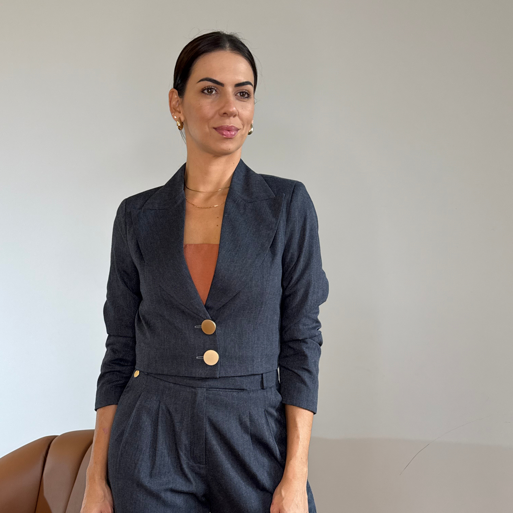 Um Blazer cropped com pose de protagonista - onde a modelagem encurta e a elegância se alonga.